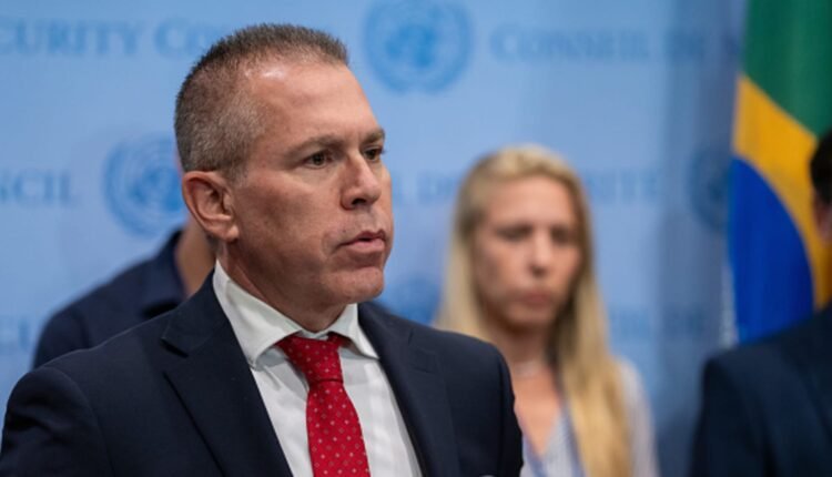 NEW YORK, NEW YORK – Permanent Representative of Israel to the United Nations Gilad Erdan addresses the press on the situation in the Middle East at the United Nations Headquarters while accompanied with family members of individuals kidnapped by Hamas on October 24, 2023 in New York City. Permanent Representative of Israel to the United Nations Gilad Erdan called for the resignation of Secretary-General of the United Nations António Guterres for not supporting Israel. (Photo by David Dee Delgado/Getty Images)