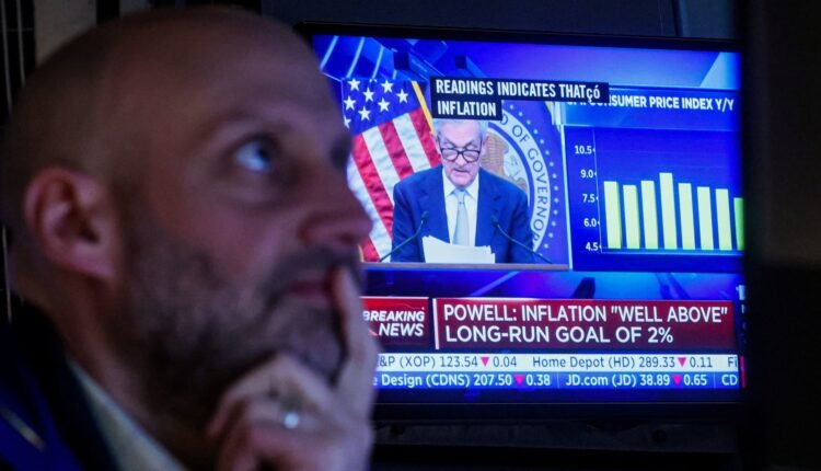 Traders react as Federal Reserve Chair Jerome Powell is seen delivering remarks on a screen, on the floor of the New York Stock Exchange (NYSE) in New York City, March 22, 2023.