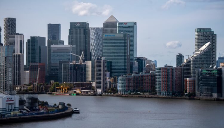 Skyscrapers in the Canary Wharf financial, business and shopping district in London, UK.